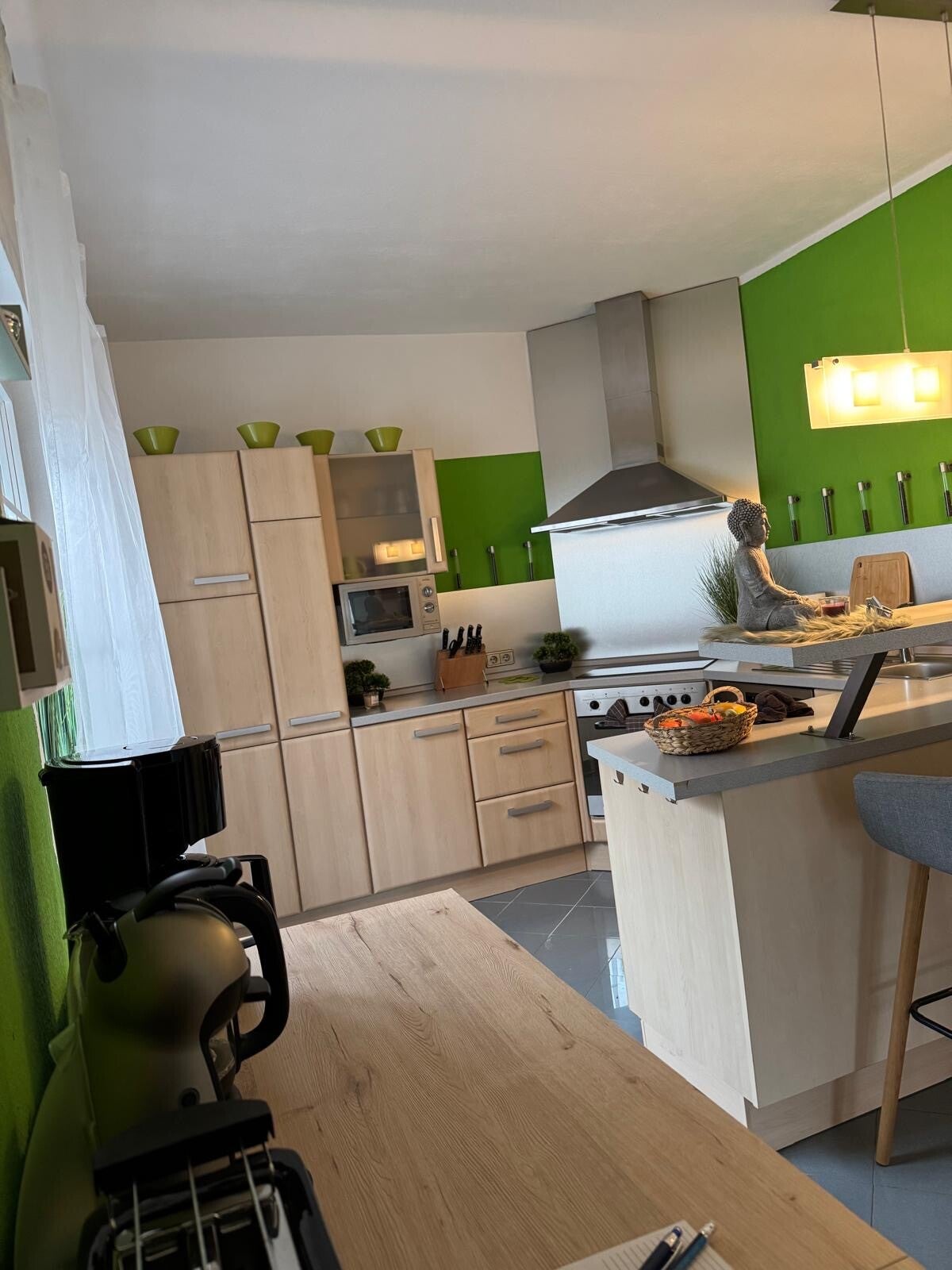 - voll ausgestatte Küche (Herd, Ofen, Mikrowelle, Spülmaschine, Kaffeemaschine, Wasserkocher, Toaster, Töpfe & Geschirr). Kleine Tee- und Kaffeeauswahl sowie die übliche Haushaltsausstattung